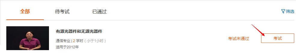1.进入”个人中心“->”学习中心“->"我的考试"可查看到所有”待考试“或”已通过“的课程。如果课程没有参加过考试或者考试未通过,点击”考试“,即可开始进行考试。