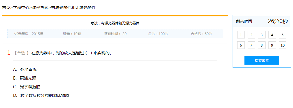 2.当点击考试后,页面跳转到考试页面,屏幕右侧会显示考试时间与考题数量。当答题结束后点击提交试卷,系统会判定您是否通过考试。